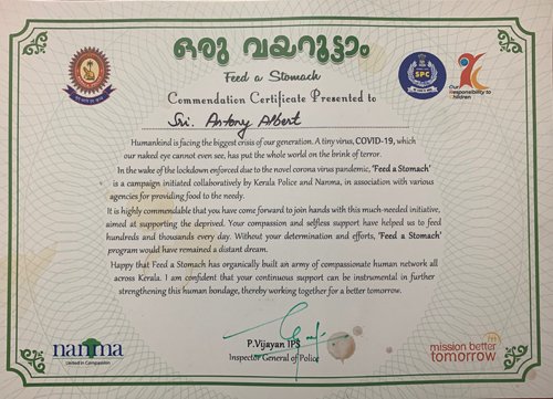 Recognized for the effort in joining hands with various agencies to provide food via the campaign “Feed a Stomach” at the time of Covid Lockdown.